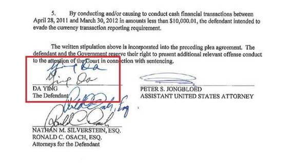英達(dá)在聯(lián)邦檢察官辦公室出具的認(rèn)罪書上簽字