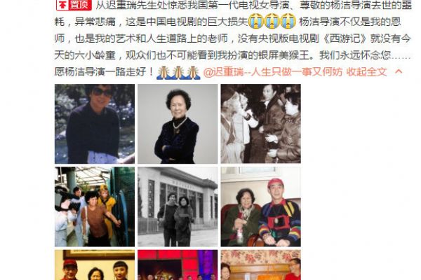 六小齡童微博發(fā)文稱:“從遲重瑞先生處驚悉我國第一代電視女導(dǎo)演、尊敬的楊潔導(dǎo)演去世的噩耗,異常悲痛,這是中國電視劇的巨大損失, 楊潔導(dǎo)演不僅是我的恩師,也是我的藝術(shù)和人生道路上的老師,沒有央視版電視劇《西游記》就沒有今天的六小齡童,觀眾們也不可能看到我扮演的熒幕美猴王。我們永遠(yuǎn)懷念您……愿楊潔導(dǎo)演一路走好!”