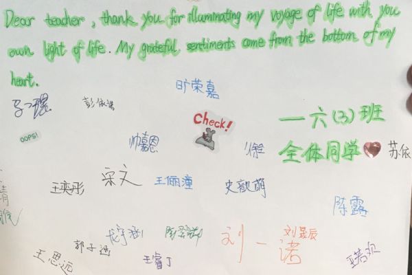 六3中隊(duì)的家長與隊(duì)委一同策劃,精心制作給每位老師一張全班簽名的賀卡,作為畢業(yè)班的特殊禮物。