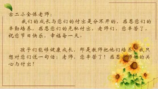 一首小詩《教師禮贊》表達(dá)了每一位古二少年對老師的贊美與感激之情;一首歌曲《長大后我就成了你》訴說著劉陽老師從一名大學(xué)生轉(zhuǎn)變?yōu)楣鈽s的人民教師的真情實感;一個溫暖的小故事濃縮了古二教師在平凡的崗位上兢兢業(yè)業(yè)、無私奉獻(xiàn)的忙碌身影