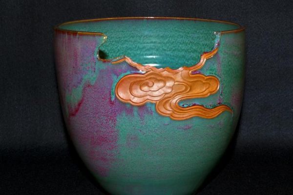 “祥云系列”之《云起云墮》——作品的造型是畫缸的一種,劉志鈞的本意是用淺浮雕在胎體的外壁刻畫,但在雕刻的時(shí)候,中間的一條曲線刻得過深,使得整個云紋團(tuán)的上半部掉了下來。在可惜之余,劉志鈞又發(fā)揮出大膽的想象,經(jīng)過仔細(xì)觀察和思考,他頓覺這種“隔空呼應(yīng)”的結(jié)果未必不是美的其他表現(xiàn)形式。正如“云起云墮”是一種偶然,也是一種必然,它或許已飄向遠(yuǎn)方,它或許已墮在瓶底,人生不也如斯嗎?