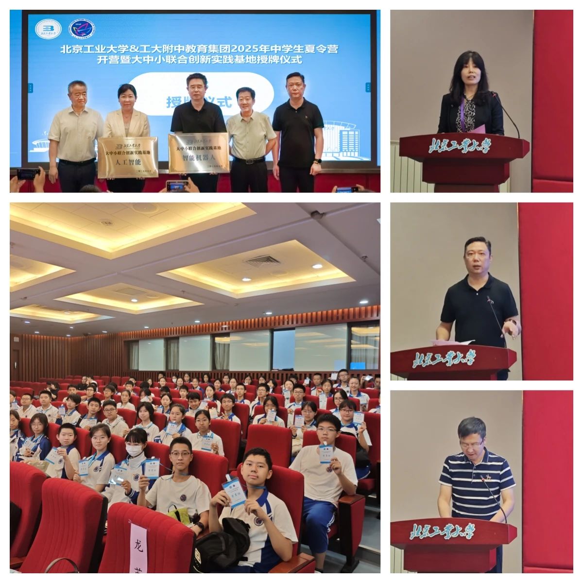 北京工業(yè)大學(xué)和工大附中教育集團(tuán)領(lǐng)導(dǎo)高度關(guān)注此次夏令營(yíng)活動(dòng),為此次活動(dòng)的成功舉辦提供了堅(jiān)實(shí)保障。7月2日上午,北京工業(yè)大學(xué)&工大附中教育集團(tuán)2025年中學(xué)生科技夏令營(yíng)開(kāi)營(yíng)暨大中小聯(lián)合創(chuàng)新實(shí)踐基地成立授牌儀式在北工大人文樓二層報(bào)告廳(學(xué)藝講堂)順利舉行。信科學(xué)院、計(jì)算機(jī)學(xué)院、物光學(xué)院、機(jī)能學(xué)院、交通學(xué)院、招生辦、基教中心、工大附中教育集團(tuán)各法人校及大中小聯(lián)合創(chuàng)新實(shí)踐基地負(fù)責(zé)人參加。外聯(lián)處副處長(zhǎng)、基教中心副主任、工大附中副校長(zhǎng)龍英主持開(kāi)營(yíng)儀式;22位教授率領(lǐng)團(tuán)隊(duì)分別組建了5個(gè)跨學(xué)科項(xiàng)目組,共計(jì)開(kāi)設(shè)18門(mén)科學(xué)課程;10位中學(xué)指導(dǎo)教師全程駐組觀摩,并協(xié)助項(xiàng)目開(kāi)展;二十余名本科生、研究生作為朋輩導(dǎo)師共同組織指導(dǎo)學(xué)生開(kāi)展科訓(xùn)項(xiàng)目。整個(gè)營(yíng)訓(xùn)過(guò)程圍繞科學(xué)教育主題,在濃厚的學(xué)術(shù)氛圍中讓學(xué)生深刻感受到科技創(chuàng)新的魅力。