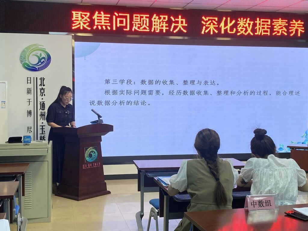 在單元整體教學(xué)匯報(bào)環(huán)節(jié),由張雅慧老師進(jìn)行研究?jī)?nèi)容闡述。以“基于問(wèn)題解決的數(shù)據(jù)整理與表達(dá)”為主題,從課程標(biāo)準(zhǔn)解讀、學(xué)業(yè)要求、單元教材分析、學(xué)情分析、課時(shí)安排與學(xué)習(xí)路徑設(shè)計(jì)幾個(gè)方面展開(kāi)匯報(bào)。
