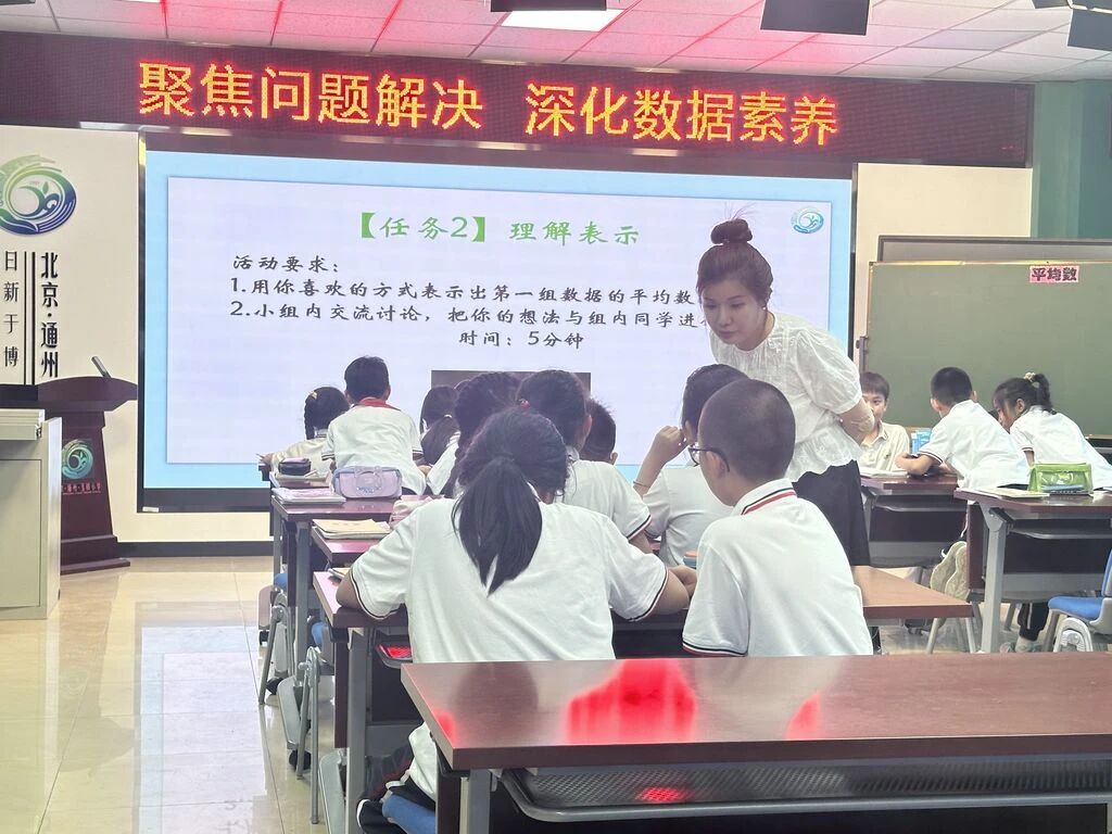 第二節(jié)課是由四年級(jí)柴雨婷老師執(zhí)教的《平均數(shù)》,她的設(shè)計(jì)思路是在矛盾沖突中理解統(tǒng)計(jì)量的意義。教學(xué)以“學(xué)生拍球比賽成績(jī)分析”為驅(qū)動(dòng)性問(wèn)題,教師設(shè)置“兩組學(xué)生拍球總數(shù)不同,如何比較整體水平”的認(rèn)知沖突,引發(fā)學(xué)生對(duì)“平均數(shù)”必要性的深度思考。通過(guò)“移多補(bǔ)少”操作活動(dòng)與“公式計(jì)算”的抽象概括,學(xué)生逐步建立平均數(shù)“代表一組數(shù)據(jù)集中趨勢(shì)”的數(shù)學(xué)模型。在柴老師組織的活動(dòng)中,學(xué)生提出平均數(shù)是一個(gè)“虛擬的數(shù)”進(jìn)一步理解了“平均數(shù)”的本質(zhì)特征。課堂還特別設(shè)計(jì)“數(shù)據(jù)變化對(duì)平均數(shù)的影響”探究環(huán)節(jié),引導(dǎo)學(xué)生對(duì)比分析數(shù)據(jù)變化,深刻理解平均數(shù)作為統(tǒng)計(jì)量的敏感性與局限性。這種基于問(wèn)題鏈的教學(xué)設(shè)計(jì),有效突破了平均數(shù)概念教學(xué)的難點(diǎn)。