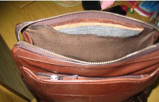 (圖示:浙江杭州的消費者投訴夢芭莎皮包內襯是用雙面膠黏著)